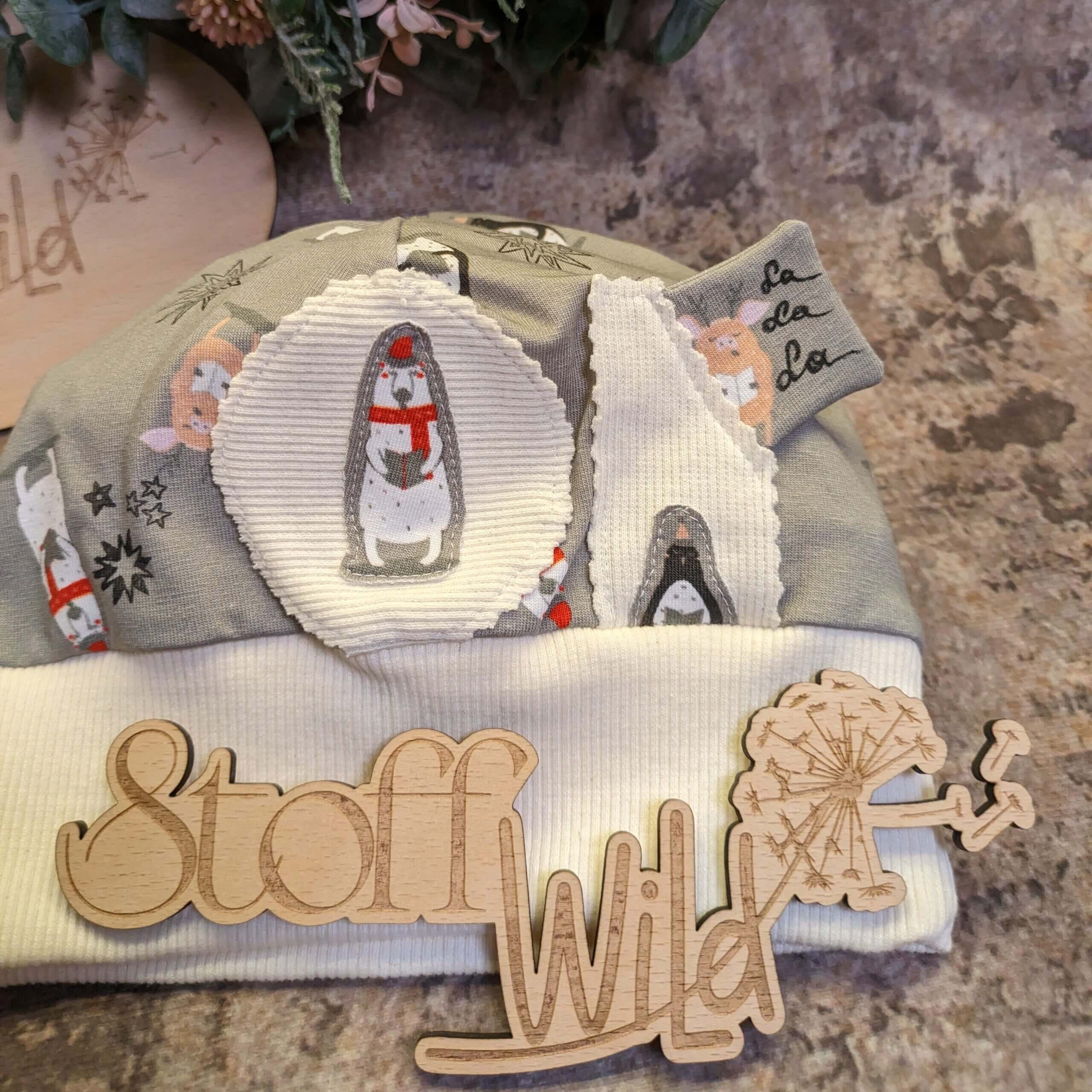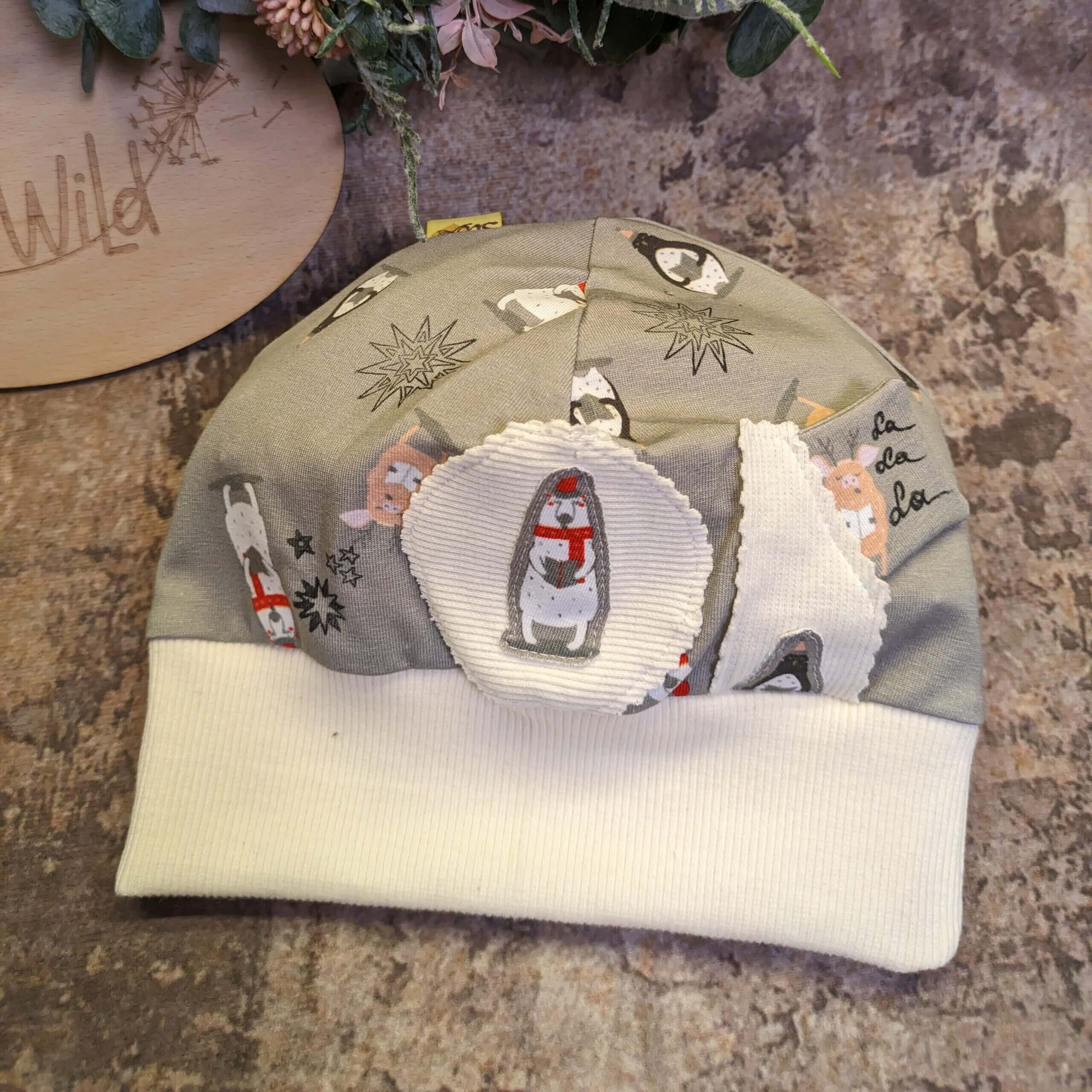 Bündchenhaube mit lustigen WinterTieren und Aufnähern