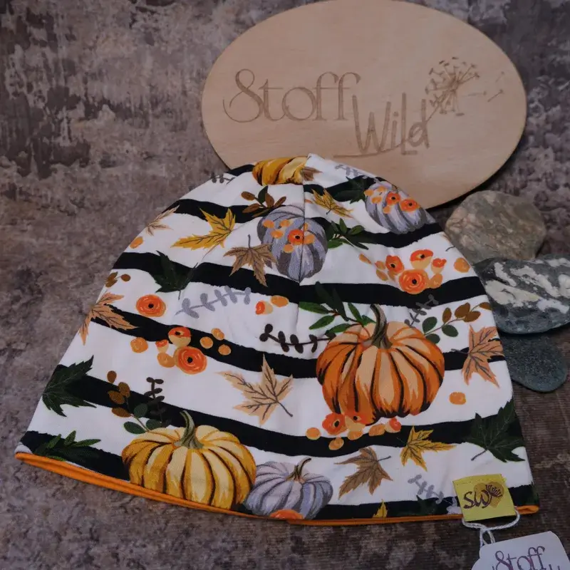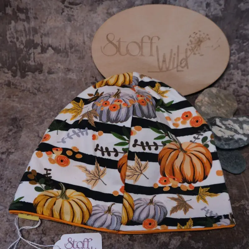 Tolle Wendebeanie aus weichem Kuschel-Sweat mit herbstlichem Muster-Mix. Die Winterhaube kann beidseitig getragen werden: eine Seite hat einen Allover-Print mit tollen Herbst-Motiven: Kürbisse in orange, grau und gelb, Blätter, Blüten und Ahornblätter. Die andere Seite ist aus Jersey in leuchtendem orange 💛 Die Beanie ist doppellagig und schützt dadurch besonders gut bei windigem Wetter und bei Kälte im Winter. Größe / Kopfumfang: S: ca. 46-50cm