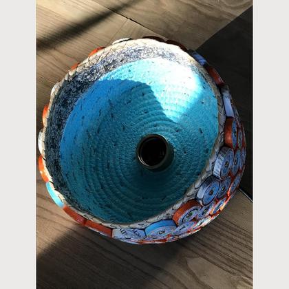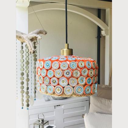 Wie seine kleine Schwester ist diese Lampe gleich gefertigt. Jedoch hat sie eine andere Form und einen Durchmesser von 21 cm. Ebenfalls innen mit einem hübschen türkiston.