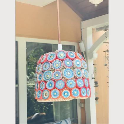 Noch so ein Hingucker! Diese fröhlich, bunte Lampe ist wieder ein hübsches Beispiel für upcycling. Auf einen Korb wurden in liebevoller Kleinarbeit bunte Papierkreisel (gerollt und gefalzt) aufgesteckt. Durchmesser 17 cm. Innen besticht sie durch einen hellen Türkiston. Einfach zum Verlieben....