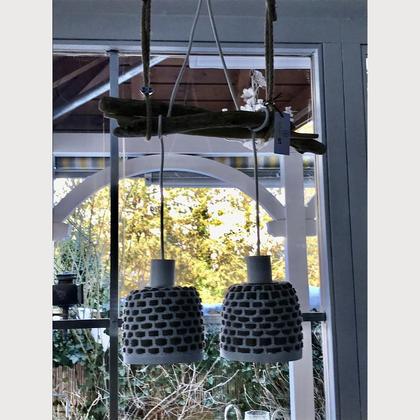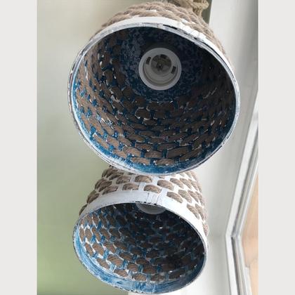 Die Korblampe ist ein mediterranes upcycling Leuchtmittel. Außen Weiß gestrichene Körbe mit Hanfseil durchwoben, innen Petroleum gebürstet. Da denkt man sofort an Meer und laue Sommerabende. Auf „griechischem Schwemmholz“ hat sie eine originelle Aufhängung erhalten.