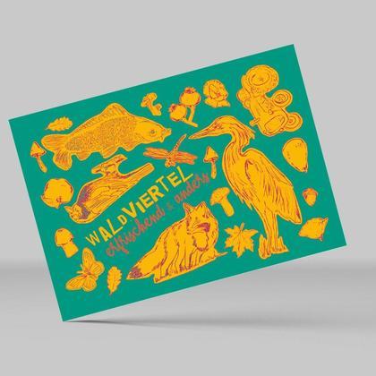 Illustrierte Ansichtskarte mit Karpfen, Mohnblume, Eierschwammerl, Reiher, Fuchs und vielen anderen Symbolen - typisch Waldviertel Im Waldviertel ist es immer erfrischend & anders! von Hand gezeichnete Motive - gedruckt auf 260 g Postkartenkarton