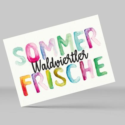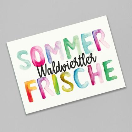 Sommerfrische im Waldviertel - beliebt und garantiert eine Abkühlung. Lettering aus Aquarell - gedruckt auf 260 g Postkartenkarton Schreib mal wieder einem lieben Menschen!