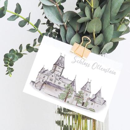 Grußkarte mit illustriertem Motiv Schloss Ottenstein im Waldviertel - ein romantischer Ort nahe des Ottensteiner Stausees von Hand gezeichnet und auf Postkartenkarton (260 g) gedruckt Schreib mal wieder einem lieben Menschen!