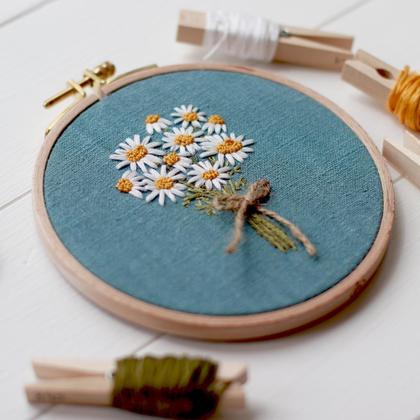 Ein Blumenstrauß der nie welk wird. Der Kamillenstrauß ist auf Leinenstoff handgestickt. Der hochwertige Buchenholzrahmen hat einen Durchmesser von ca. 13cm. Die Rückseite ist mit weißem Kreativpapier verkleidet.