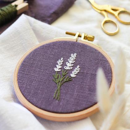 Weißer Lavendel wurde auf etwas gröberen lila Leinen handgestickt. Der hochwertige Buchenholzrahmen ist ca. 10cm groß.