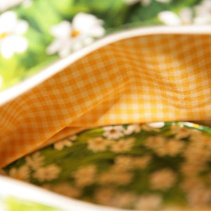 Kosmetiktasche „Wiese“, h x b x t 26 x 30 x 6,5 cm, Baumwolle, wattiert, mit Reißverschluß außen, handgeflochtener Griff, innen mit kleinen seitlichen Taschen. Waschbar Feinwäsche 30 Grad.