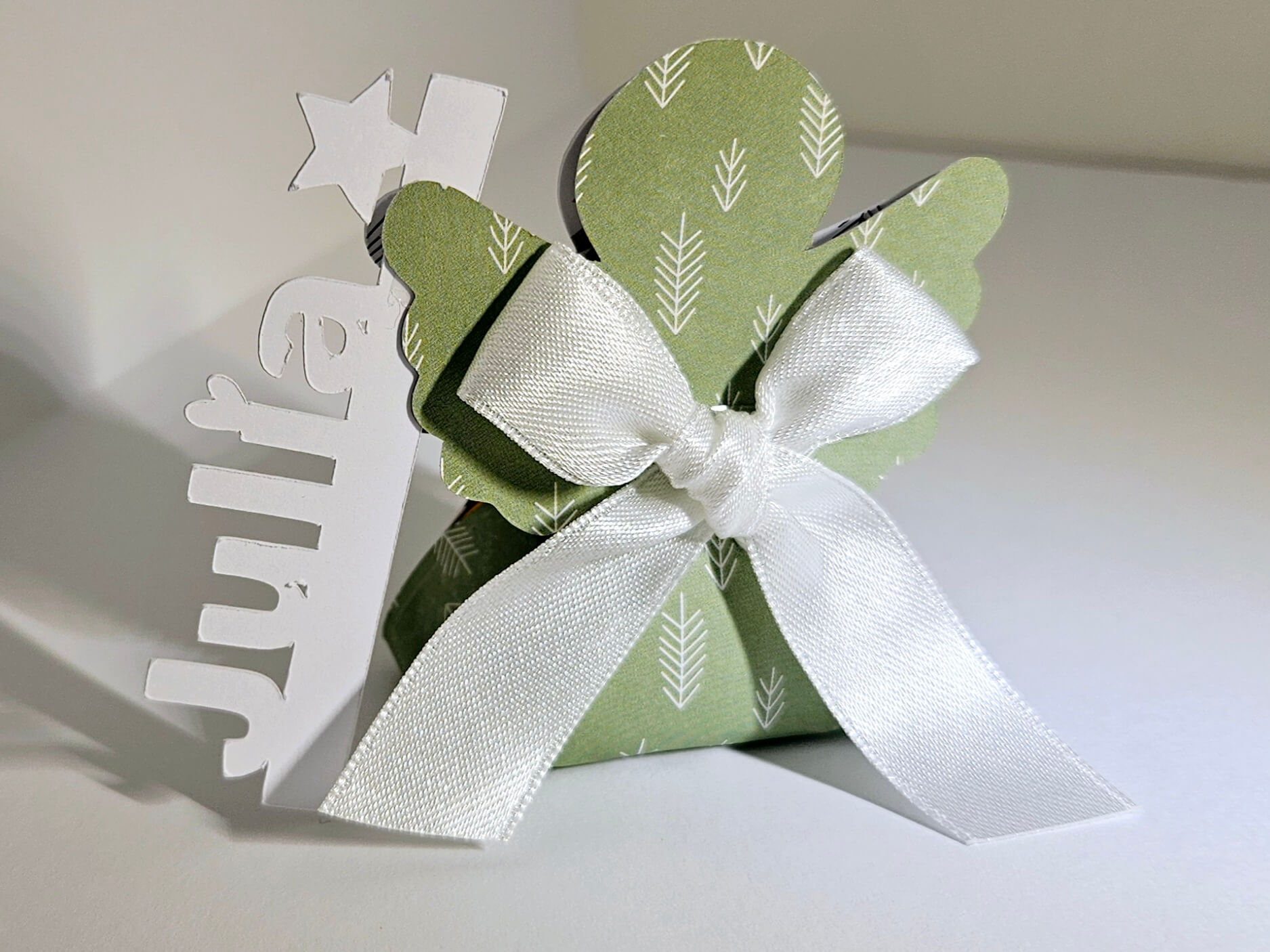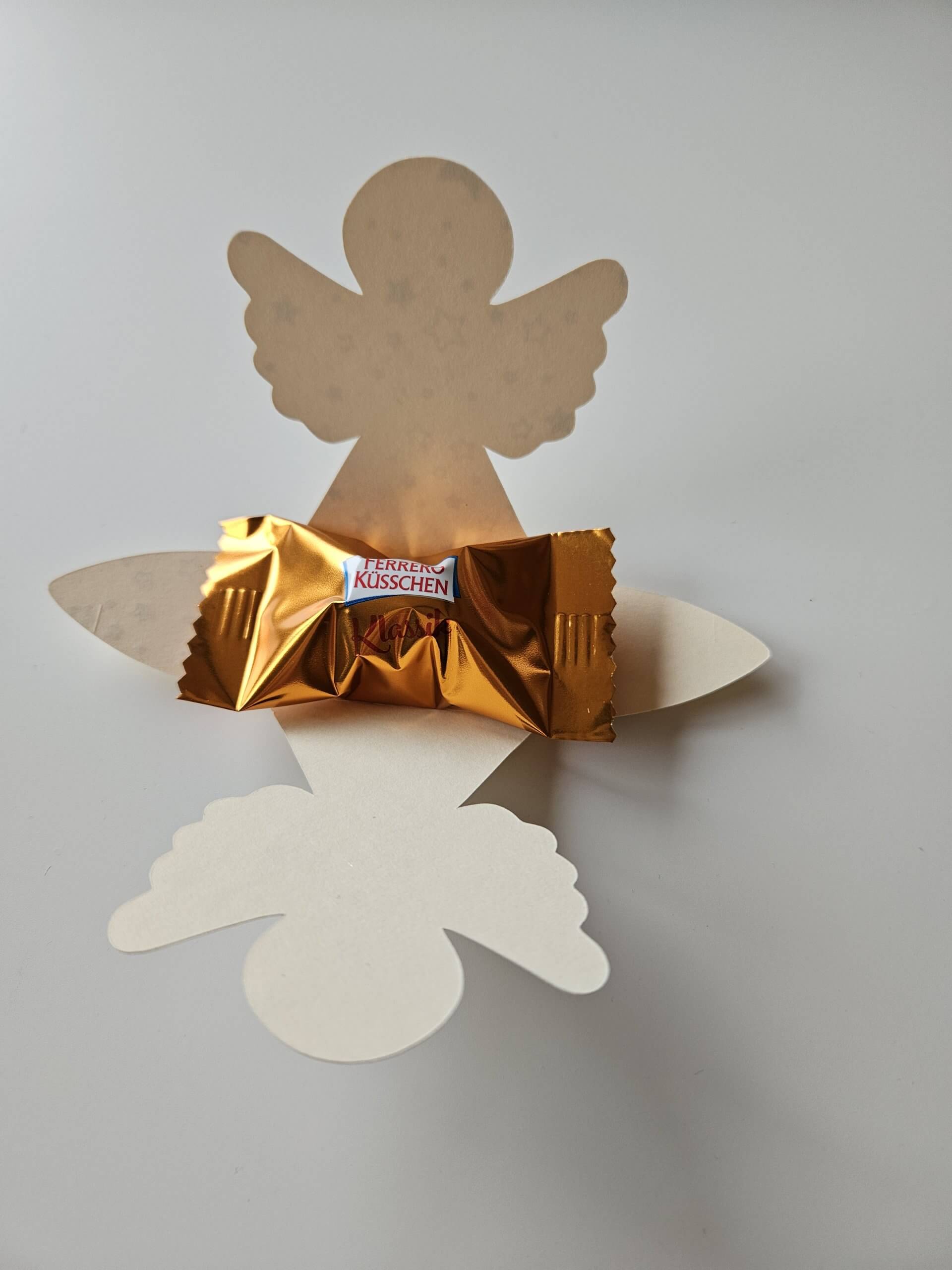 Der Papierengerl ist mit einem Ferrero "Küsschen" gefüllt und kann individuell mit einem Namen personalisiert werden. Es gibt unterschiedliche Papierdesigns (weißes Papier mit silbernen oder goldenen Sternen, weihnachtliches Muster etc.) Größe: rund 7cm Breite bei den Flügeln und ca. 6 cm hoch Diese Engerl werden gerne als Weihnachtstisch-Deko, als Mitbringsel für Kollegen bestellt. Preis: Das Engerl neutral kostet 2,50 Euro, der einzelne Name kostet 0,50 Für die Personalisierung bitte eine Nachricht mit den gewünschten Namen.