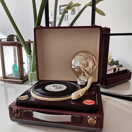 Ein cooler alter tragbarer Plattenspieler, der nicht mehr funktionierte, ist zu einer Lampe umgebaut worden - mit Rücksicht auf die Optik mit möglichst geringer Veränderung! Der Deckel lässt sich aushängen und extra aufbewahren oder an der Wand oder dem Leuchtmittel (abgebildetes LED-Leuchtmittel dabei) anlehnen; Im Plattenspieler lag beim Kauf eine Single - "Nur ein Lied" von Thomas Forstner, die gebe ich natürlich aus Gründen der Authentizität dazu! ;-) Ohne Leuchtmittel lässt sich der Deckel auch schließen und leicht transportieren.