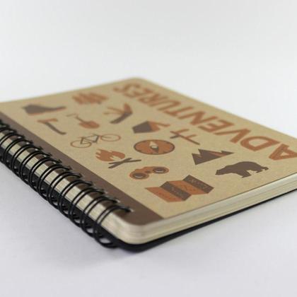 --Spiralnotizbuch "Adventures"-- Kleines Notizbuch mit Spiralbindung, von Hand zugeschnitten. Handgebunden. Wird auf Bestellung angefertigt. Cover: brauner Recyclingkarton, professionell bedruckt Größe: DIN A6 (10,5 x 14,8 cm) 60 Seiten (30 Blatt) cremefarbenes holzfreies Papier aus Österreich, blanko schweres Papier (170 g/m²) Rückkarton aus stabiler schwarzer Pappe abgerundete Ecken Dazu passt der Bleistift "Adventures", ebenfalls in unserem Shop erhältlich. (Bleistift im Lieferumfang dieses Notizbuchs nicht enthalten, bitte separat bestellen.) Für größere Stückzahlen bitte eine Anfrage schicken.