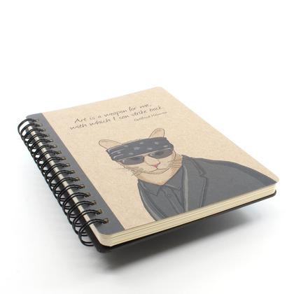 --Spiralnotizbuch mit Gottfried Helnwein als Katze--, mit einem seiner berühmten Zitate. Kleines Notizbuch mit Spiralbindung, von Hand zugeschnitten. Handgebunden. Wird auf Bestellung angefertigt. Cover: brauner Recyclingkarton, professionell bedruckt Größe: DIN A6 (10,5 x 14,8 cm) 60 Seiten (30 Blatt) cremefarbenes holzfreies Papier aus Österreich, blanko schweres Papier (170 g/m²) Rückkarton aus stabiler schwarzer Pappe abgerundete Ecken Dazu passt der Bleistift "Sophisticats", ebenfalls in unserem Shop erhältlich. (Bleistift im Lieferumfang dieses Notizbuchs nicht enthalten, bitte separat bestellen.) Für größere Stückzahlen bitte eine Anfrage schicken.