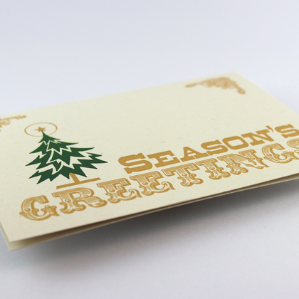 Weihnachtskarte „Season’s Greetings“, Weihnachtsbaum, vintage, Golddruck