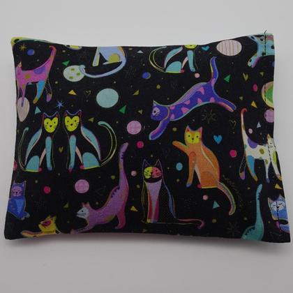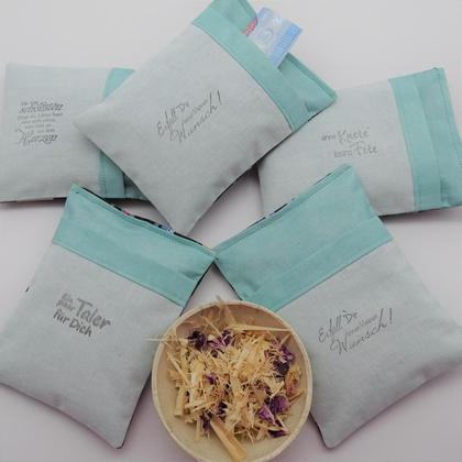 Diese --Duftkissen haben ein kleines Einschubfach--, einen Gutschein oder Geldscheine stecken kannst. Das ist viel persönlicher, als wenn du das Geld nur in einen Umschlag überreichst. Diese kleinen Pölster duften wunderbar, da sie mit Zirbenflocken und Rosenblüten gefüllt sind. Für die Rückseite habe ich einen edlen schwarzen Stoff mit Katzenmotiven gewählt. Maße der Kissen: ca. 11,5 cm x 15,5 cm