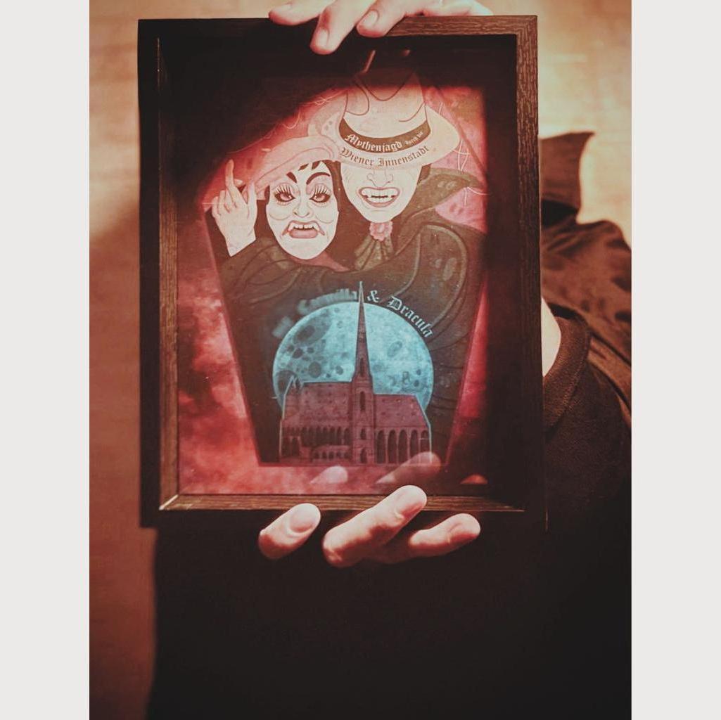 Mythenjagd Zubehör Eingerahmtes Bild von ‘Carmilla und Dracula im Sarkophag’ Eigenschöpferisches Werk 29 x 21 cm