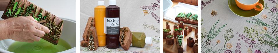 Mit erlesenen handgefertigten Holz-/Messingmodeln werden Motive einer Blumenwiese auf reinem naturfarbenem Leinen gedruckt, mit farbechten Stofffarben. Der handbedruckte Leinenstoff wird von mir zu Tischdecken, Tischläufern und Kissen genäht, jedes Stück ein Unikat.