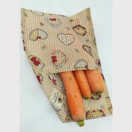 Die große L Tasche bewährt sich in Mehrpersonenhaushalten, zum Frischhalten von Obst, Gemüse Brot und Gebäck. Frisches Brot reingeben, Klappe andrücken,an einem kühlen Ort (auch Kühlschrank) oder Brotlade aufbewahren, so hast du lange weiches Brot.Obst und Gemüse (Karotten) halten sich in dieser Tasche im Kühlschrank einfach länger frisch. Die Taschenklappe kurz andrücken, durch die Handwärme haftet sie von selbst. Natürlich kann man unsere Bienenwachsprodukte im Kühlschrank verwenden (noch längere Haltbarkeit von Obst, Gemüse, Brot). atmungsaktiv wiederverwendbar – reinigen mit kaltem Wasser und mildem Spülmittel Jedes Produkt ist ein handgemachtes Unikat, es kann daher kleine Unregelmäßigkeiten aufweisen. Hergestellt aus reinen zertifizierten Naturmaterialien – Baumwolle und Bienwachs. FCM zugelassen für Lebensmittelkontakt — eine Konformitätserklärung ist bei uns auf Anfrage erhältlich. Nicht in die Waschmaschine, Geschirrspüler oder Mikrowelle geben. Nicht in die Sonne oder am Heizkörper legen. Keinen heißen Inhalt reingeben. Nicht geeignet für rohes Fleisch und Fisch. Bei Kontakt mit Schimmel ist das Produkt zu entsorgen. Dein Wachstuch oder -tascherl wird wieder wie neu wenn du es kurz mit dem Fön anwärmst.