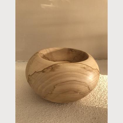 bauchige Schüssel gedrechselt, gestauchtes Buchenholz, geölt, relative kleine Ausbuchtung, 18 × 18 × 10 cm