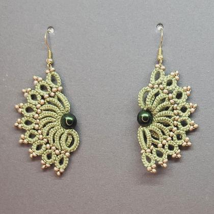 Halbmondförmige Ohrhänger, deren Machart auch etwas an Ammonite (fossile Schnecken) erinnert, aus olivgrüner Baumwolle mit dunkelgrünen Wachsperlen und gold bedampften Rocailles.