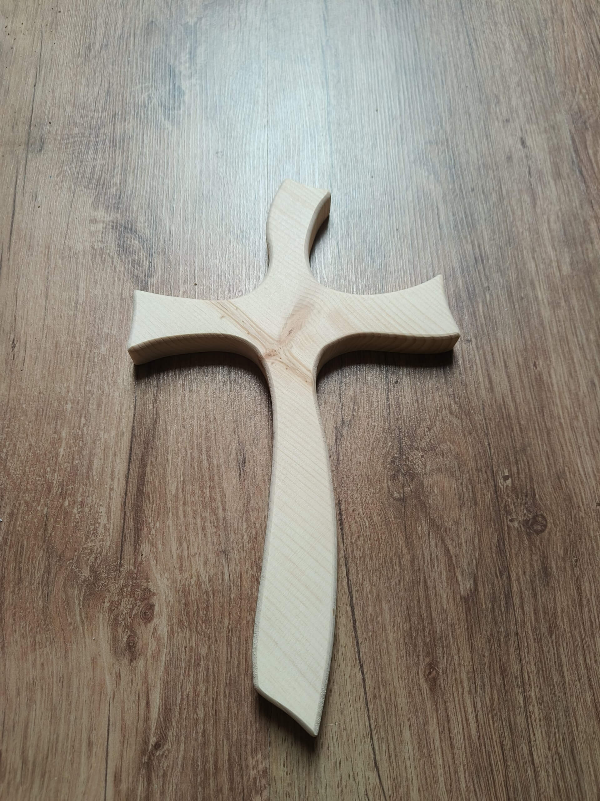 Formschönes Kreuz aus massiven Zirbenholz mit Bilderhacken Aufhänger an der Rückseite. Höhe ca. 30cm Dicke ca. 2cm