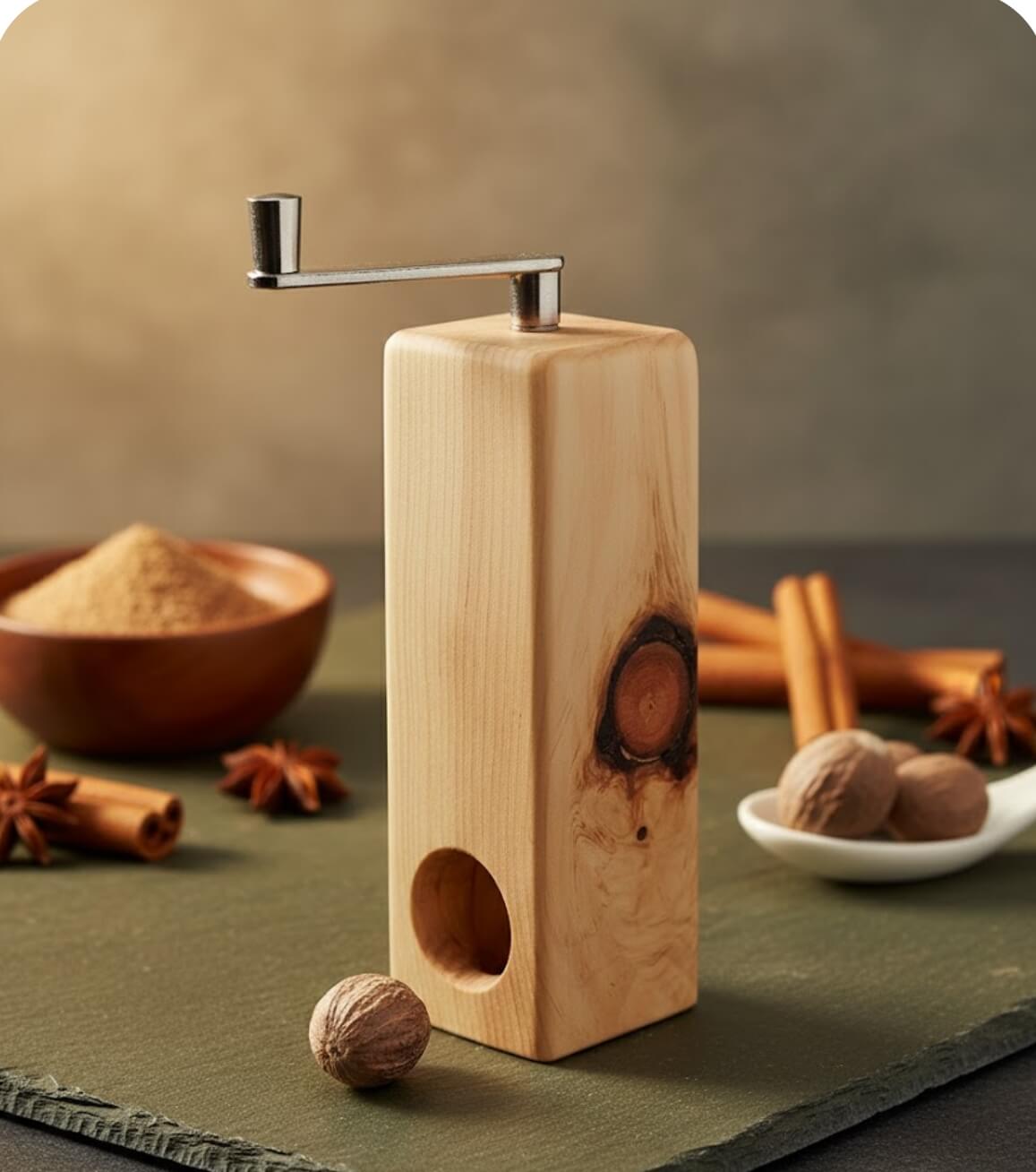 Robuste Muskatnussmühle aus Zirbenholz mit dem Mahlwerk von Strässler. Einfach den Hebel nach oben ziehen die Muskatnuss reinlegen und los geht's. Zum verfeinern von Suppen,Sossen,Fleischgerichten und Püree.