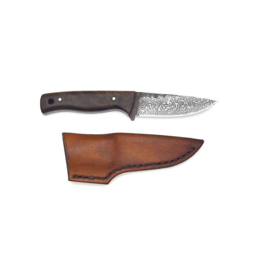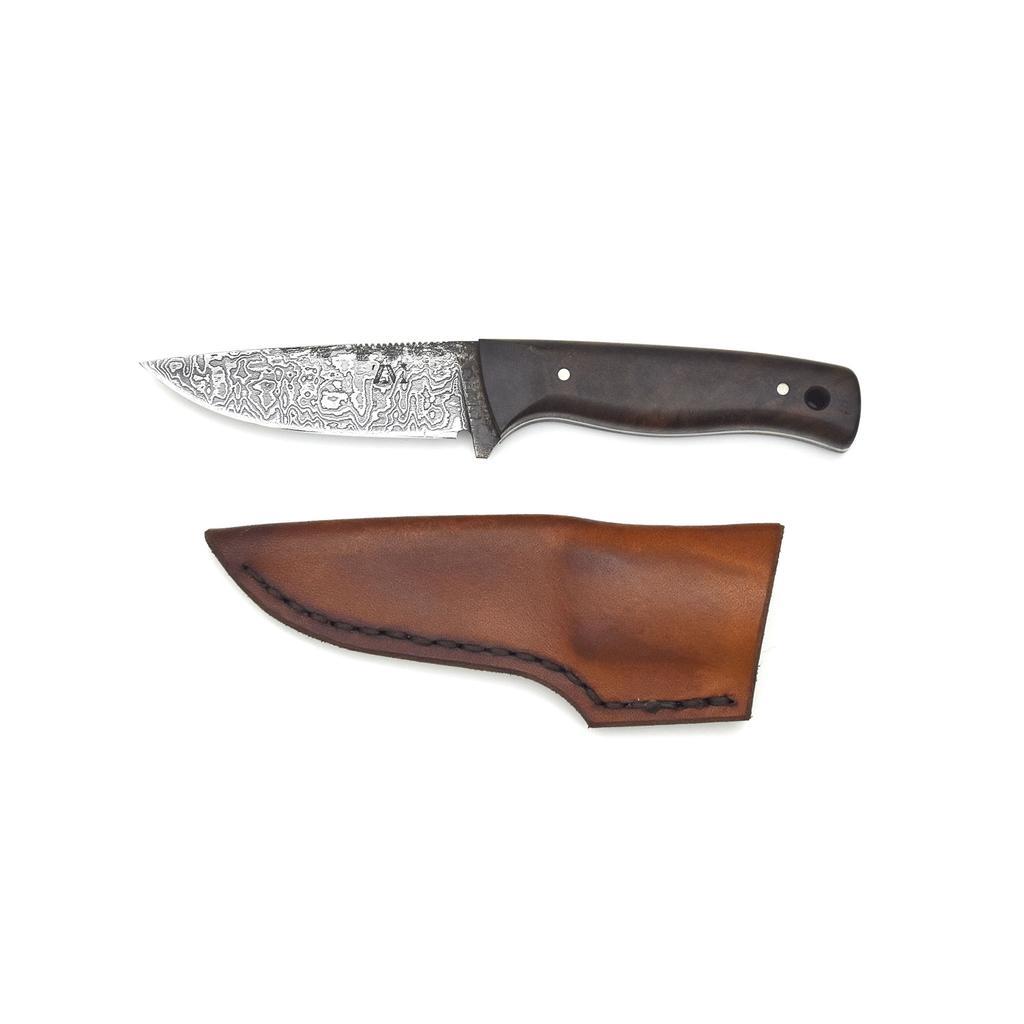 Das Dreifingermesser D2 ist ein EDC-Messer perfekt für jede Hosentasche. EDC steht für Every-Day-Carry und somit ist das Messerchen ein treuer Begleiter für den Alltag. Aufgrund seines geringen Gewichts, sowie seiner kompakten Größe, kann man das Messerchen stets bequem bei sich tragen. Der Vorteil hierbei, im Vergleich zum klassischen Klappmesser, ist die feststehende und somit stabile Klinge. Trotz seiner handlichen Ausführung, liegt es mit 3 Fingern gehalten, sicher in der Hand. Die passgenaue Lederscheide bietet Schutz und ergänzt das Dreifingermesser als nützlichen Begleiter unterwegs. Die durch reine Handarbeit hergestellte Klinge ist aus drei, unterschiedlich legierten Klingenstählen zu mehrlagigem Damast geschmiedet. Diese altbewährte Methode der Stahlverarbeitung ermöglichte es früher die Qualität des Stahls erheblich zu verbessern. Heutzutage ist diese Herstellmethode aus qualitativer Sicht nicht mehr zwingend notwendig. Die von mir verwendeten modernen Stähle weisen bereits, jeder für sich, höchste Qualität auf. Auch die Lagenanzahl ist aus mechanischer Sicht mittlerweile irrelevant. Einzig das nur dadurch erzeugbare Muster der Klinge unterstreicht die Einzigartigkeit meiner ZM-Messer. Der somit hergestellte Damaszenerstahl ermöglicht durch sein feines Gefüge eine langanhaltende, rasiermesserscharfe Schneide. Die Härte der Klinge beträgt zwischen 60-62 HRC. Durch die Verwendung der sehr reinen Stähle ist das Kochmesser aus Damast jedoch nicht rostfrei. Dadurch bedarf es einer gewissen Pflege, wie zum Beispiel das Abtrocknen der Klinge nach dem Gebrauch. Weitere Details dazu finden Sie in den Pflegeanleitungen. Die charakteristische, rustikale Schmiedeoberfläche mit den sichtbaren Hammerschlägen ist ebenso ein Beweis für die Einzigartigkeit des Messers, wie die individuellen Griffschalen aus unterschiedlichen heimischen oder auch exotischen Hölzern. Der ca. 2mm starke, durchgehende Erl garantiert höchste Stabilität auch bei etwas gröberen Anwendungen. Die durch filigrane Feilarbeit erzeugte Profilierung am Klingenrücken des Dreifingermessers bietet als Daumenauflage perfekten Gripp. Zusätzlich ist sie ein optischer Akzent und ein echter Hingucker. Die widerstandsfähige und sorgfältig von Hand gefertigte Lederscheide aus echtem Rindsleder bietet perfekten, passgenauen Sitz der Klinge. Dadurch ist das Dreifingermesser D2 auch unterwegs sicher aufbewahrt. Auf Wunsch ist die Lederscheide, anstatt in Dunkelbraun, auch in Rotbraun oder Schwarz erhältlich. Ein ZM-Messer ist für die Ewigkeit geschmiedet, darum inkludiert Ihr Kauf einen lebenslangen Schärf- und Reparaturservice. Für das selbstständige Nachschärfen zwischendurch empfehle ich die Messerschleifer der Firma HORL. Wenn der Grundschliff erneuert werden muss, können Sie mir Ihr Messer einfach zusenden. Neben dem Messer sind im Lieferumfang enthalten: eine handgenähte Lederscheide, sowie eine detaillierte Pflegeanleitung. Eckdaten: Klingenstahl: 60 Lagen Damast Gesamtlänge: 150 mm Klingenlänge: 70 mm Klingenstärke: ca. 2 mm --Achtung!-- --Bitte nehmen Sie in dringenden Fällen vorab Kontakt mit mir auf, damit ich Ihnen die genaue Lieferzeit nennen kann.-- --Diese kann je nach Auftragslage und Komplexität variieren--