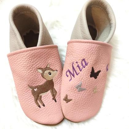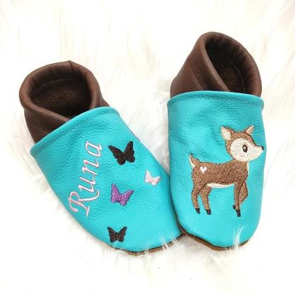 Bei Zwucki werden alle Lederpatscherl individuell nach deinem Wunsch angefertigt. Deine persönlichen Wünsche teile mir bitte per Kommentarfeld im Warenkorb mit, oder schicke mir eine Anfrage. Deine Bestellung sollte folgendes beinhalten: -) Welche Lederfarbe für die Kappe? -) Welche Lederfarbe für die Ferse? -) Welche Größe? -) Welcher Stickname soll gestickt werden? --Größe-- Größe 18/19: 11,5 cm Sohlenlänge, Größe 20/21: 12,5 cm Sohlenlänge, Größe 22/23: 14,5 cm Sohlenlänge, Größe 24/25: 16 cm Sohlenlänge, Größe 26/27: 17,5 cm Sohlenlänge, Größe 28/29: 19 cm Sohlenlänge, Größe 30/31: 20,5 cm Sohlenlänge, Größe 32/33: 21,5 cm Sohlenlänge, Größe 33/34: 23 cm Sohlenlänge --Material-- Für die Produktion der Lederpatschel verwende ich ausschließlich qualitativ hochwertiges Rinderleder, welches nach deutschen Richtlinien frei von PCP, PCB, AZI-Farbstoffen, CH2O, Quecksilber, Cadmium, Lösungsmittel und FCKW ist. --Sohle-- Die Lederpuschen werden mit einer tolle rutschhemmenden Sohle aus Veloursleder genäht. Diese wird nach einiger Zeit glatt. Mit einer Drahtbürste kannst du sie einfach wieder etwas aufrauen. --Die richtige Größe-- Die Krabbelschuhe sollen ein Geschenk zur Geburt, Taufe oder 1. Geburtstag sein? Dann empfehle ich die Größe 20/21. Diese passt in den meisten Fällen mit rund einem Jahr. Um die richtige Größe für dein Kind zu ermitteln, messe diesen bitte ab und rechne 1,5 cm dazu. Am einfachsten und genauesten funktioniert das abmessen, wenn das Kind auf einem Blatt Papier steht. Einmal im Kreis zeichnen und die Distanz von Ferse bis zum großen Zeh messen. Dazu werden 1,5cm addiert. Fusslänge + 1,5 cm = Sohlenlänge --Leder Eigenschaften-- Es ist verschleißfest und passt sich super an. Dabei behält es seine Form, noch dazu ist es atmungsaktiv und dadurch wirkt es temperaturausgleichend. Eignet sich hervorragend für Zuhause, Kindergarten und beim Turnen durch rutschhemmende Veloursohle. Es kann zur Struktur- und Farbabweichungen kommen, weil Leder ein Naturmaterial ist. Die Qualität bleibt trotzdem sehr hochwertig. Die Puschen sind nicht waschbar, bitte nur mit einem feuchten Tuch reinigen. Schnittmuster "Puschen von klimperklein (www.klimperklein.de)"