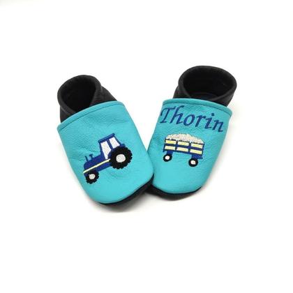 Bei Zwucki werden alle Lederpatscherl individuell nach deinem Wunsch angefertigt. Deine persönlichen Wünsche teile mir bitte per Kommentarfeld im Warenkorb mit, oder schicke mir eine Anfrage. Deine Bestellung sollte folgendes beinhalten: -) Welche Lederfarbe für die Kappe? -) Welche Lederfarbe für die Ferse? -) Welche Größe? -) Welcher Stickname soll gestickt werden? --Größe-- Größe 18/19: 11,5 cm Sohlenlänge, Größe 20/21: 12,5 cm Sohlenlänge, Größe 22/23: 14,5 cm Sohlenlänge, Größe 24/25: 16 cm Sohlenlänge, Größe 26/27: 17,5 cm Sohlenlänge, Größe 28/29: 19 cm Sohlenlänge, Größe 30/31: 20,5 cm Sohlenlänge, Größe 32/33: 21,5 cm Sohlenlänge, Größe 33/34: 23 cm Sohlenlänge --Material-- Für die Produktion der Lederpatschel verwende ich ausschließlich qualitativ hochwertiges Rinderleder, welches nach deutschen Richtlinien frei von PCP, PCB, AZI-Farbstoffen, CH2O, Quecksilber, Cadmium, Lösungsmittel und FCKW ist. --Sohle-- Die Lederpuschen werden mit einer tolle rutschhemmenden Sohle aus Veloursleder genäht. Diese wird nach einiger Zeit glatt. Mit einer Drahtbürste kannst du sie einfach wieder etwas aufrauen. --Die richtige Größe-- Die Krabbelschuhe sollen ein Geschenk zur Geburt, Taufe oder 1. Geburtstag sein? Dann empfehle ich die Größe 20/21. Diese passt in den meisten Fällen mit rund einem Jahr. Um die richtige Größe für dein Kind zu ermitteln, messe diesen bitte ab und rechne 1,5 cm dazu. Am einfachsten und genauesten funktioniert das abmessen, wenn das Kind auf einem Blatt Papier steht. Einmal im Kreis zeichnen und die Distanz von Ferse bis zum großen Zeh messen. Dazu werden 1,5cm addiert. Fusslänge + 1,5 cm = Sohlenlänge --Leder Eigenschaften-- Es ist verschleißfest und passt sich super an. Dabei behält es seine Form, noch dazu ist es atmungsaktiv und dadurch wirkt es temperaturausgleichend. Eignet sich hervorragend für Zuhause, Kindergarten und beim Turnen durch rutschhemmende Veloursohle. Es kann zur Struktur- und Farbabweichungen kommen, weil Leder ein Naturmaterial ist. Die Qualität bleibt trotzdem sehr hochwertig. Die Puschen sind nicht waschbar, bitte nur mit einem feuchten Tuch reinigen. Schnittmuster "Puschen von klimperklein (www.klimperklein.de)"